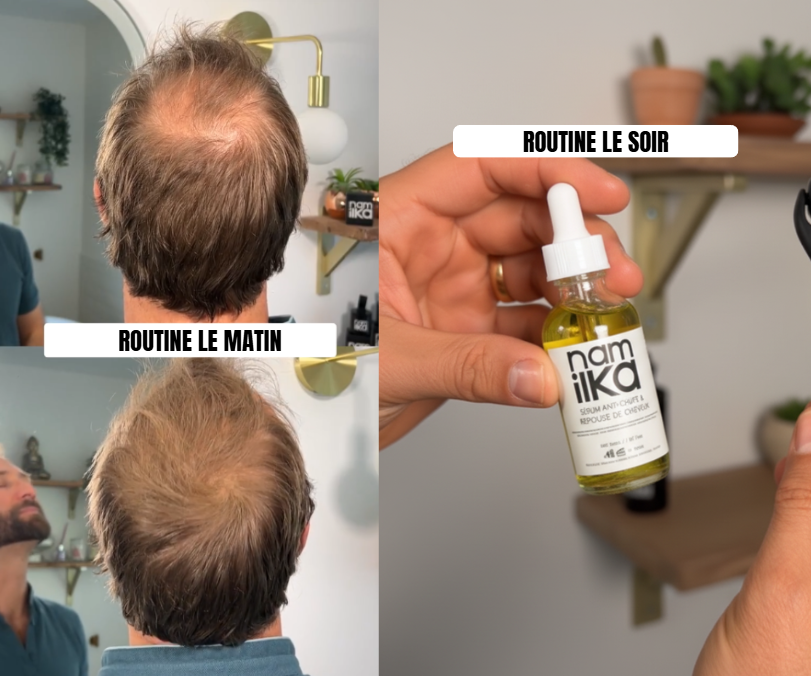Contrairement au Minoxidil, notre sérum stimule la repousse sans provoquer de chute réactionnelle.