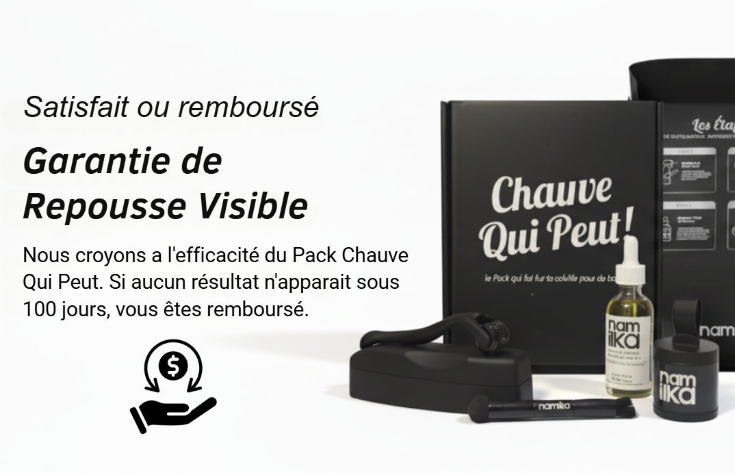 C’est un protocole complet contre la calvitie : camouflage instantané avec notre poudre capillaire, stimulation de la repousse grâce au sérum naturel fortifiant, activation du cuir chevelu avec le dermaroller, et accessoires pour une application précise.